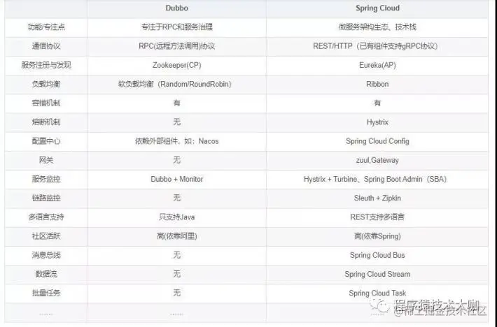通过上表对比,很容易发现Spring Cloud拥有很多的项目模块,包含了微服务系统的方方面面。Dubbo是一个非常优秀的服务治理和服务调用框架,但缺少很多功能模块,例如网关、链路追踪等。在项目模块上,Spring Cloud占据着更大的优势。对比并不是否定谁,推崇谁,只是说明在不同场景下,有利优劣,需客观来看。