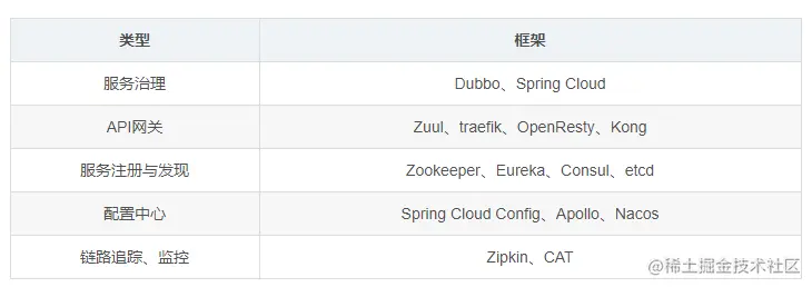 微服务架构中常提及到的主要技术框架选型如下表所示,本文后面将基于此展开说明对比。