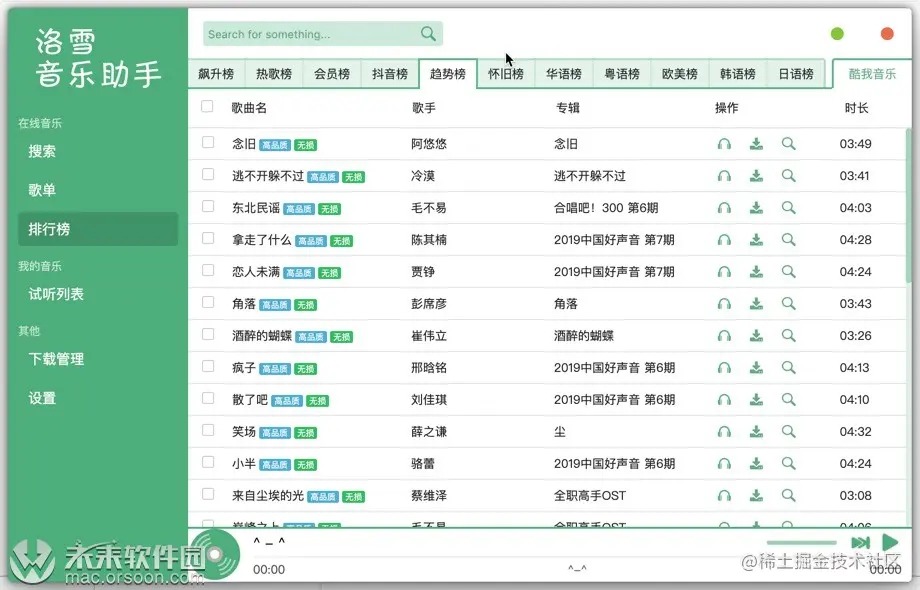 洛雪音乐助手是一款小巧的音乐播放下载器,主界面简单明了,非常的***。该软件涵盖了QQ音乐、酷我音乐、网易音乐等多个平台的音乐歌曲资源,用户可随意输入歌手、歌曲名、专辑名等信息进行智能搜索,同时还提供了普通、高品质、无损APE、无损FLAC等多种音质免费下载,用户无需登录即可直接免费试听下载各大平台的VIP、付费、无损等歌曲,是不是非常的实用?