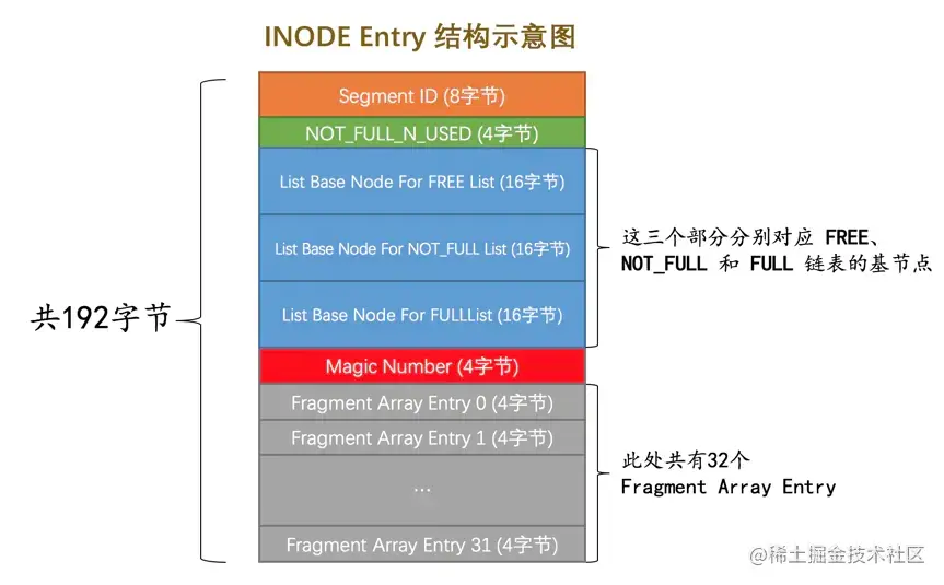 我们前边说过,段其实不对应表空间中某一个连续的物理区域,而是一个逻辑上的概念,由若干个零散的页面以及一些完整的区组成。像每个区都有对应的XDES Entry来记录这个区中的属性一样,设计InnoDB的大叔为每个段都定义了一个INODE Entry结构来记录一下段中的属性。大家看一下示意图