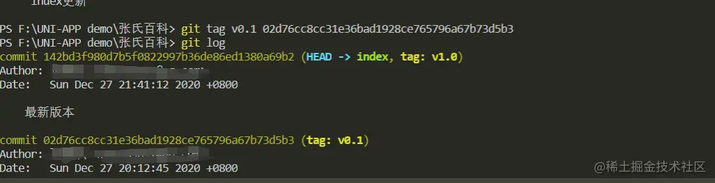 // 格式: git tag 标签名 commitId(版本ID 通过git log 获取) 例: