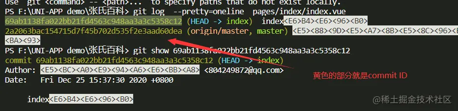git log --pretty=oneline 文件路径 //该文件commit 内容的历史记录 例: git log --pretty=oneline pages/index/index.vue