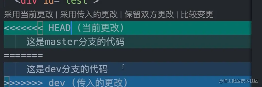 git多人协作开发时,难免会对相同文件进行操作,此时合并就产生了冲突。例如我们在index分支对demo.vue进行了操作,之后合并到主分支master中。又在dev分支对demo.vue进行了操作,再合并到主分支master的时候就会报错。VScode中会显示