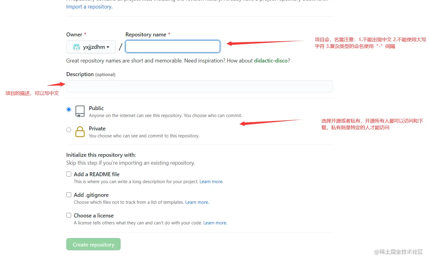 - 进入远程仓库界面,可以看到自己放在github的所有项目。如需创建新项目,点击右上角的绿色按钮New进入创建界面