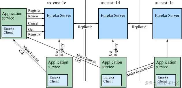 Eureka Client 又分为 Applicaton Service 和 Application Client,即服务提供者和服务消费者。每个区域有一个 Eureka 集群,并且每个区域至少有一个 Eureka Server 可以处理区域故障,以防服务器瘫痪。 Eureka Client 向 Eureka Server 注册,将自己的客户端信息提交给 Eureka Server。然后, Eureka Client 通过向 Eureka Server 发送心跳(每 30 秒一次)来续约服务。如果某个客户端不能持续续约,那么Eureka Server 断定该客户端不可用,该不可用的客户端将在大约 90 秒后从 Eureka Serve 服务注册列表中删除。服务注册列表信息和服务续约信息会被复制到集群中的每 个 Eureka Serve 节点。来自任何区域的 Eureka Client 都可以获取整个系统的服务注册列表信 息。根据这些注册列表信息,Application Client 可以远程调用 Applicaton Service 来消费服务。