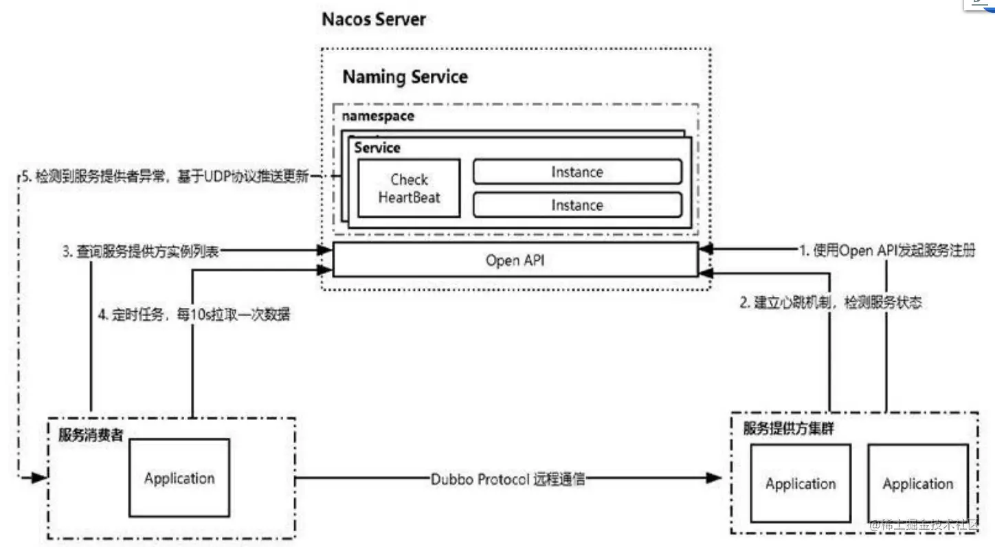 - Nacos Server:Nacos服务提供者,里面包含的Open API是功能访问入口,Config Service、Naming Service是Nacos提供的配置服务、名字服务模块。Consistency Protocol是一致性协议,用来实现Nacos集群节点的数据同步,这里使用的是Raft算法(使用类似算法的中间件还有Etcd、Redis哨兵选举)。