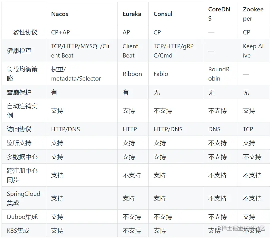 常用的注册中心对比:(图片来源developer.aliyun.com/article/698…)