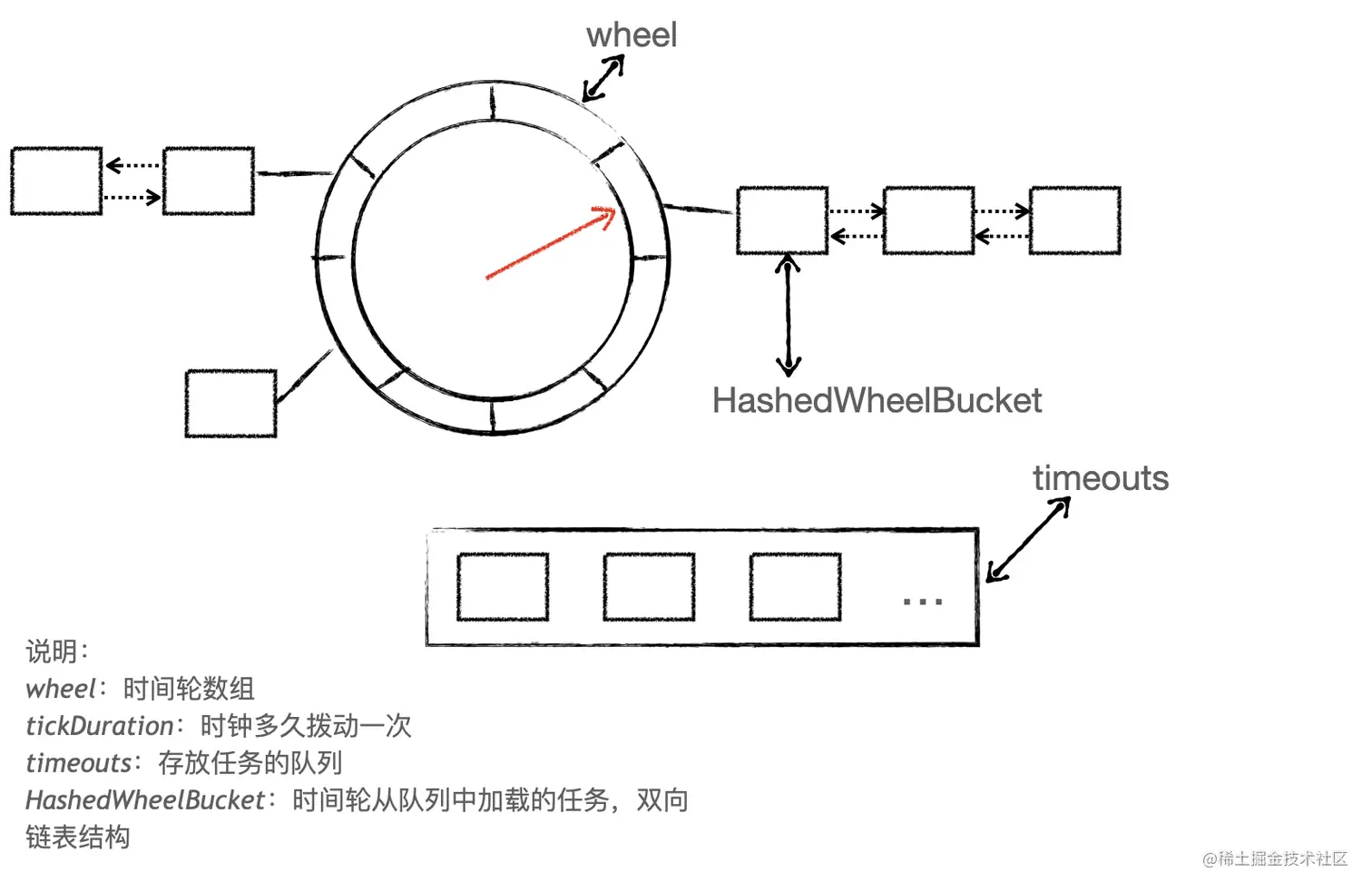很多开源框架都实现了时间轮算法,这里以 Netty 为例,看下 Netty 中时间轮是怎么实现的。