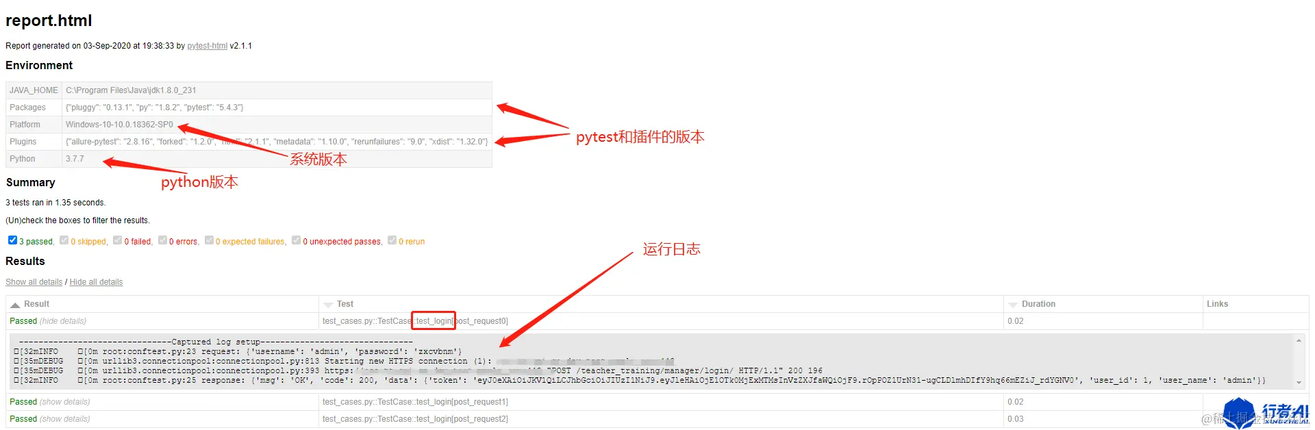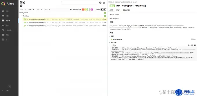 可以在ide中执行测试用例,也可以使用命令行执行,执行完测试用例后,会生成一个html格式的测试报告,在浏览器中打开就可以查看本次自动化测试的测试结果。pytest不仅支持pytest-html插件,还可以使用allure生成更加美观的测试报告。下面分别展示使用pytest-html和allure生成的html测试报告,pytest-html报告中记录的内容比较详尽,包括了用例运行日志、通过\失败\跳过用例条数、用例运行时间等等。allure生成的报告可读性比较强,可以很直观的看到测试结果。