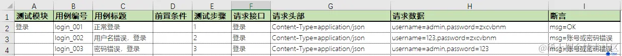 测试用例表中主要记录9列类型的数据,测试模块:将接口按照模块进行划分有利于问题的定位和数据的分类。