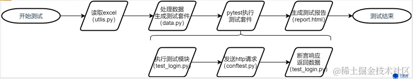 触发自动化测试之后,测试数据的提取与处理并不会使用到pytest框架,当把数据处理为测试套件后,按模块分配给pytest进行执行,包括测试模块、http请求、断言。所有模块执行完之后将测试结果体现在生成的测试报告report.html中。测试结束之后可以通过邮件或者钉钉机器人的方式通知测试或开发本次自动化测试的测试结果。