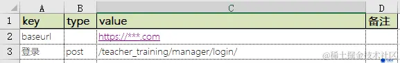 根据接口文档,将接口的地址和路径以及请求方式记录在excel表中,key:接口名称,type:请求方式,value:接口路径,第一行baseurl为基本路径,type不填。接口名称建议与接口文档中的接口名称一致,这样方便检查。如果同一个接口有多种请求方式,需要重新填写一行,type为相对应的请求方式。这样记录接口路径和请求方式是为了方便后面的数据提取和处理。