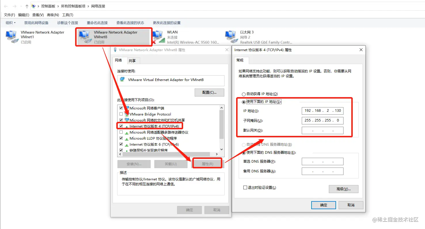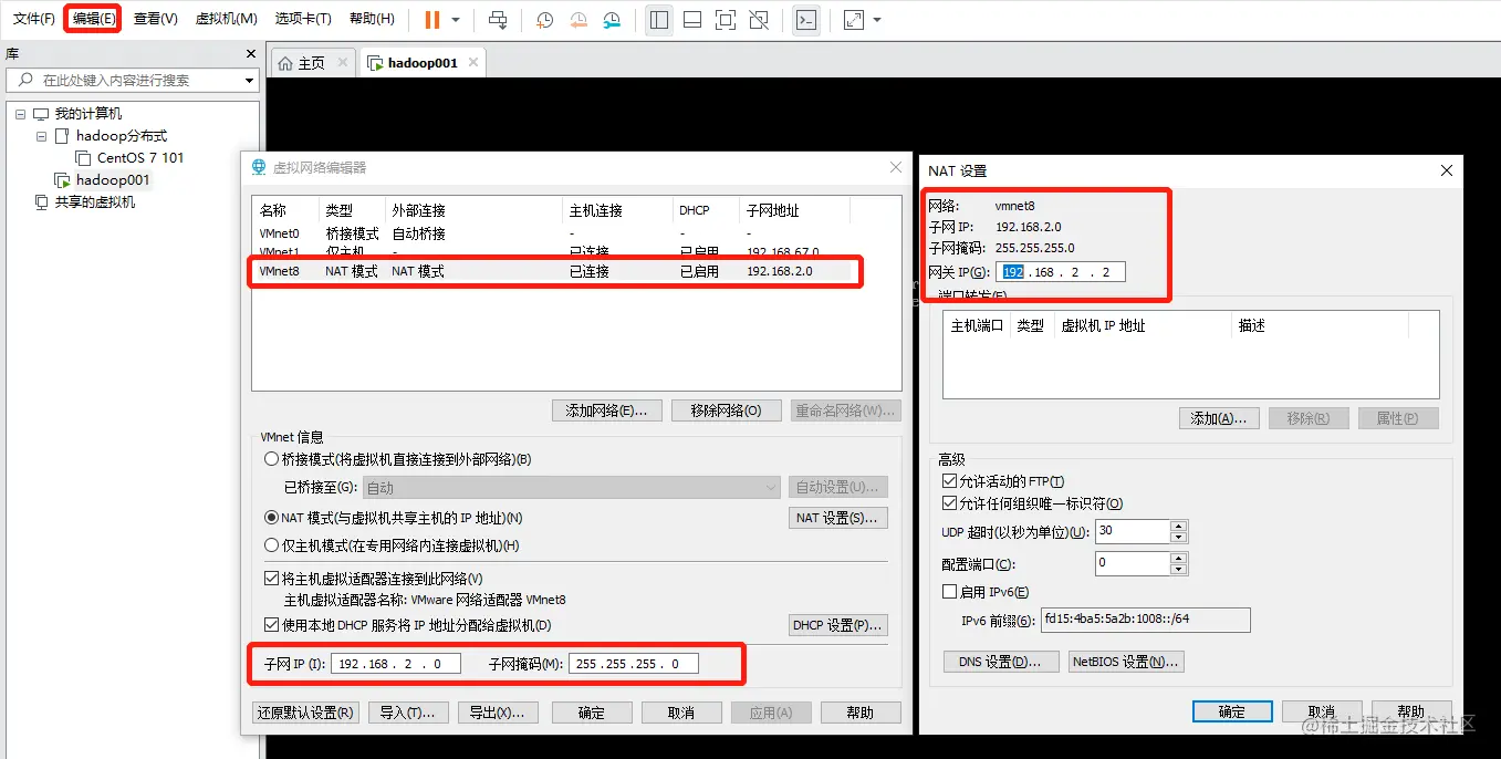 配置虚拟机 编辑-->虚拟网络编辑器 注意:配置VMnet8,和第一步一一对应上。
