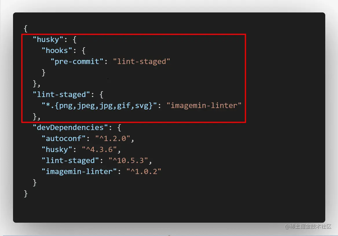 //具体代码 { "husky": { "hooks": { "pre-commit": "lint-staged" } }, "lint-staged": { "*.{png,jpeg,jpg,gif,svg}": "imagemin-linter" }, "devDependencies": { "husky": "^4.3.6", "lint-staged": "^10.5.3", "imagemin-linter": "^1.0.2" } }