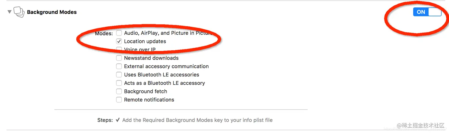 (3) allowsBackgroundLocationUpdates表示是否允许后台定位。默认为 NO。只在iOS 9.0 及以后起作用。设置为 YES 的时候必须保证 Background Modes 中的 Location updates 处于选中状态,否则会抛出异常。注意,如果不设置为YES,不需要申请该权限,否则会审核不通过!