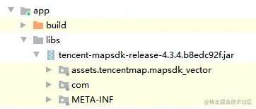 以4.3.4版本的地图功能为例,解压后,得到一个 libs文件夹,该文件夹中包含tencent-mapsdk-release-4.3.4.b8edc92f.jar文件和一个jniLibs文件夹(文件中包含所有的so库文件) -