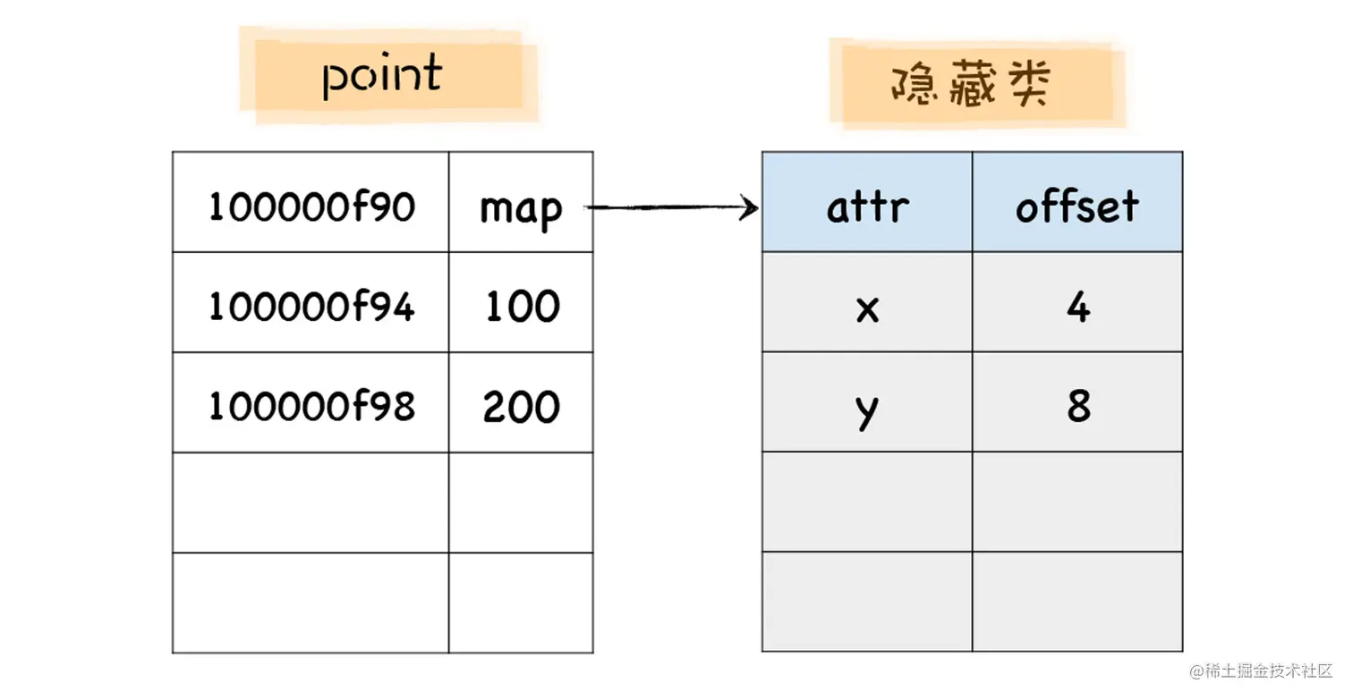 当 V8 执行到这段代码时,会先为 point 对象创建一个隐藏类,在 V8 中,把隐藏类又称为 map,每个对象都有一个 map 属性,其值指向内存中的隐藏类。隐藏类描述了对象的属性布局,它主要包括了属性名称和每个属性所对应的偏移量,比如 point 对象的隐藏类就包括了 x 和 y 属性,x 的偏移量是 4,y 的偏移量是 8。