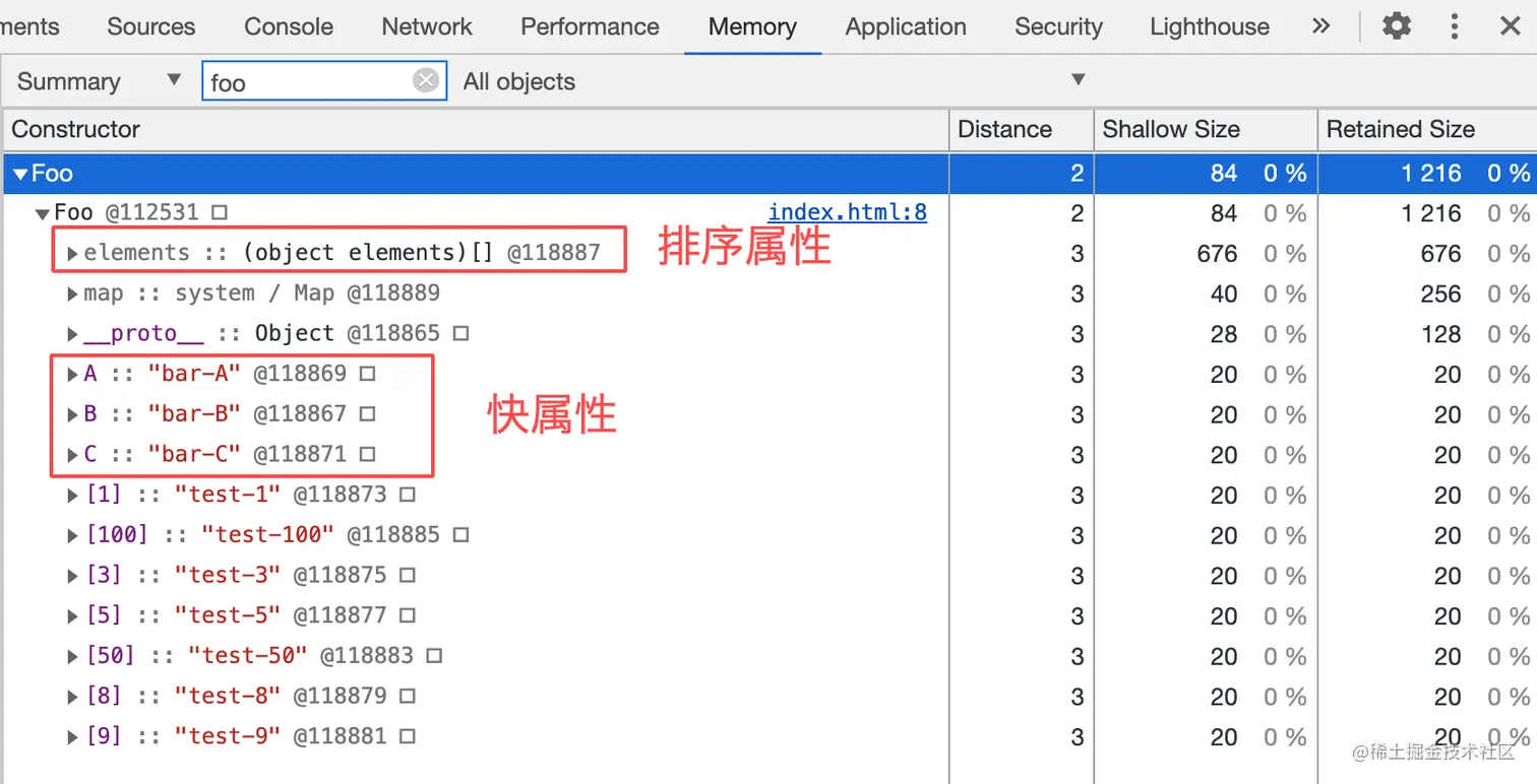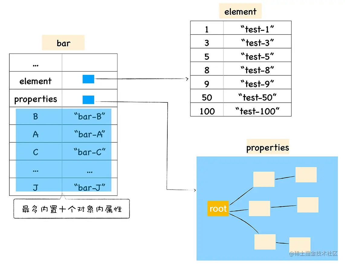 如图所示: bar 对象包含了两个隐藏属性: elements 属性和 properties 属性, elements 属性指向了 elements 对象,在 elements 对象中,会按照顺序存放排序属性, properties 属性则指向了 properties 对象,在 properties 对象中,会按照创建时的顺序保存了常规属性。