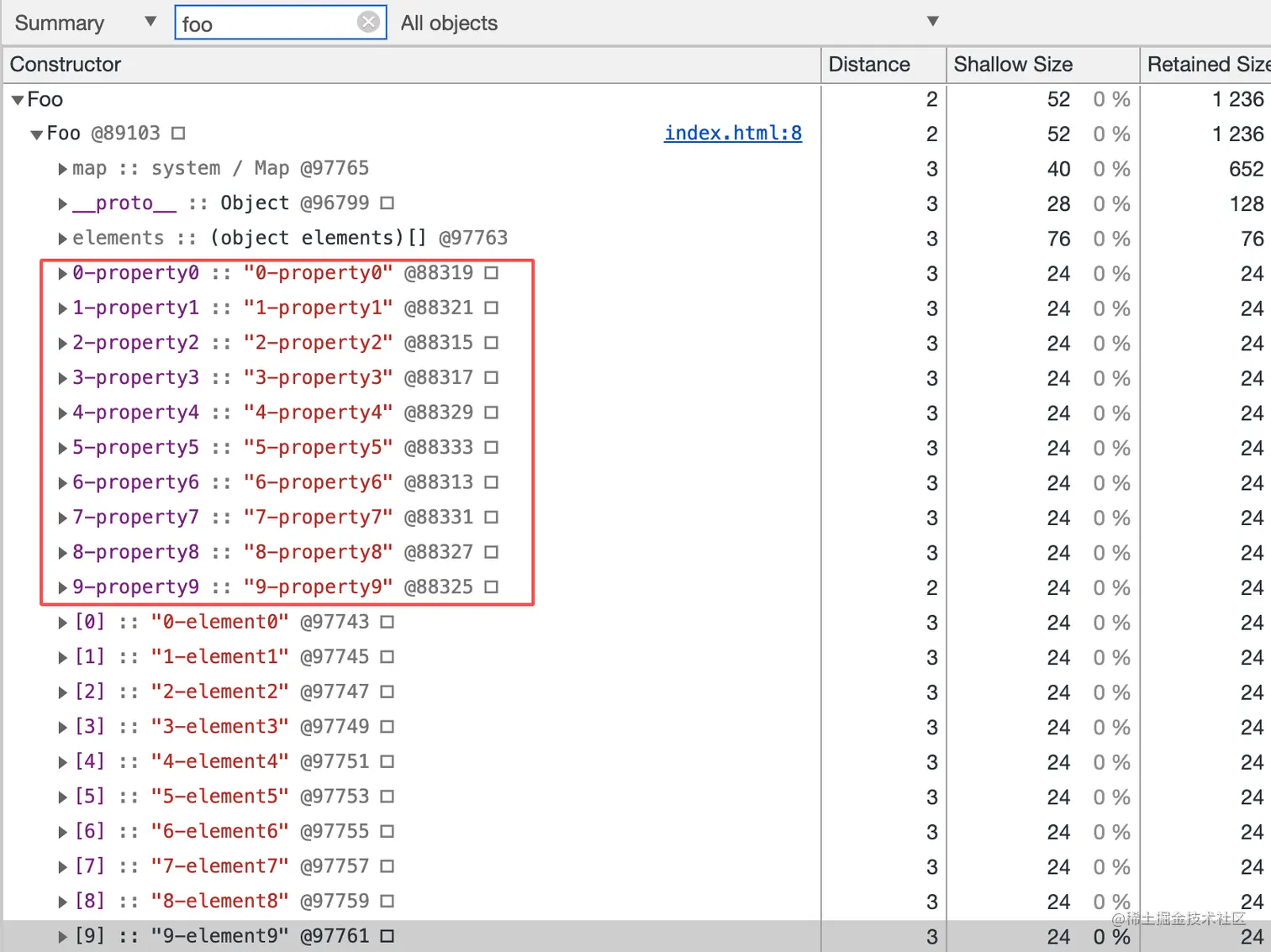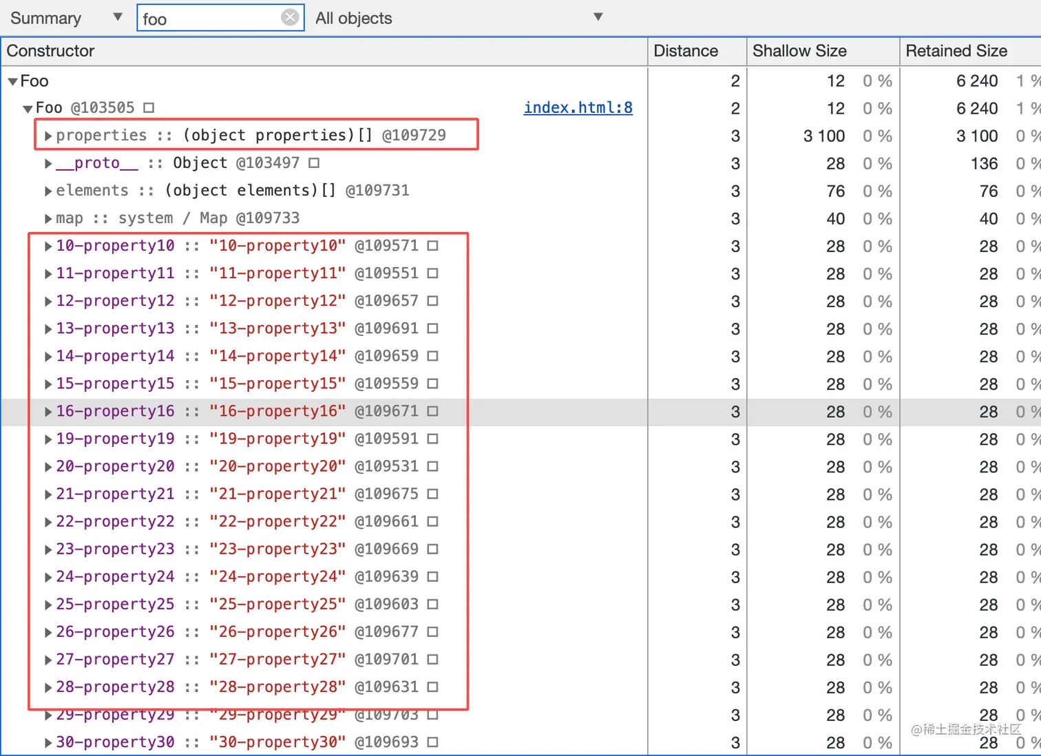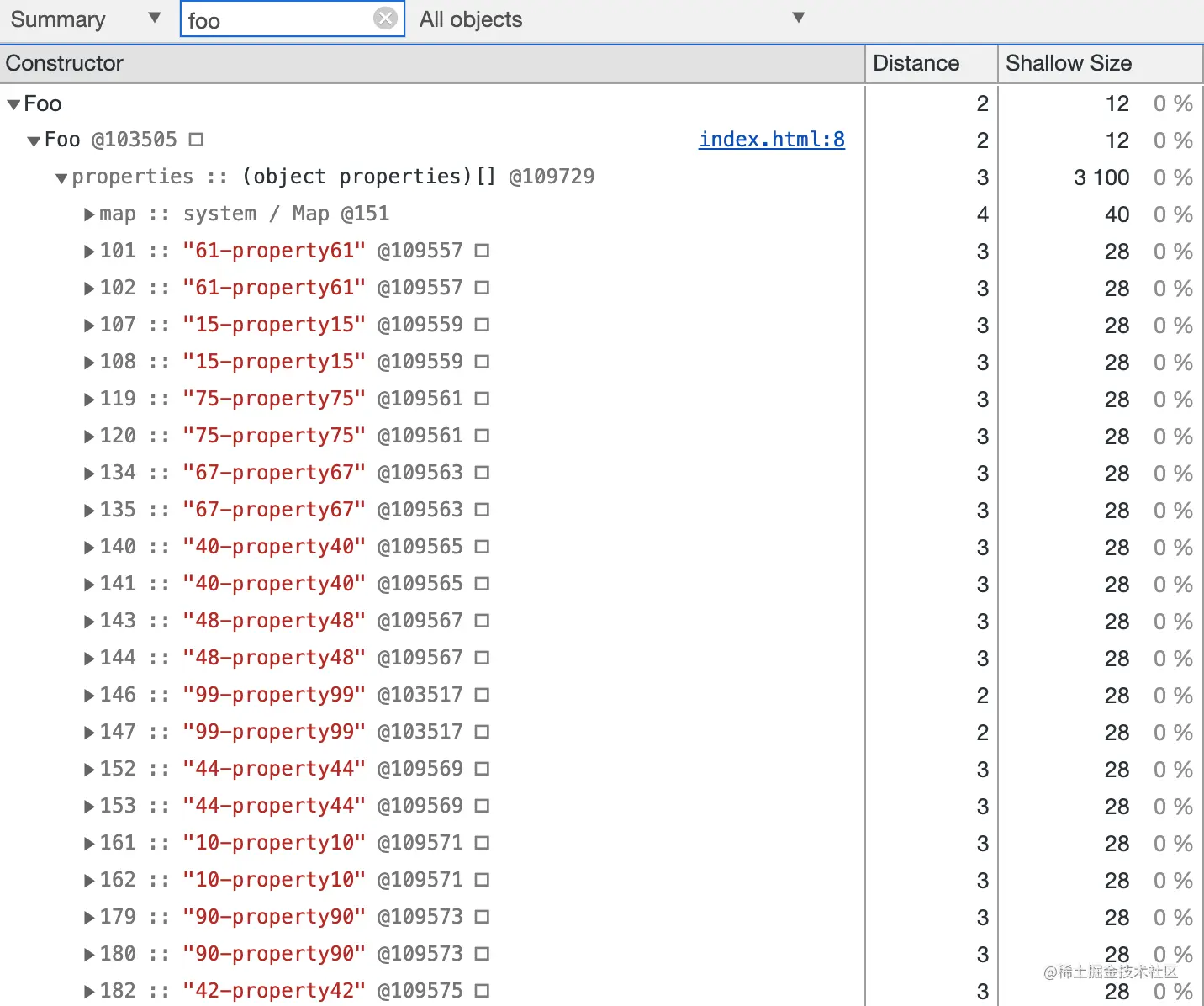 具体地讲, V8 会为每个对象创建一个隐藏类,对象的隐藏类中记录了该对象一些基础的布局信息,包括以下两点:对象中所包含的所有的属性;每个属性相对于对象的偏移量。 回到前文的截图,可以看到每个对象下有一个 map 属性,这个属性就是隐藏类。