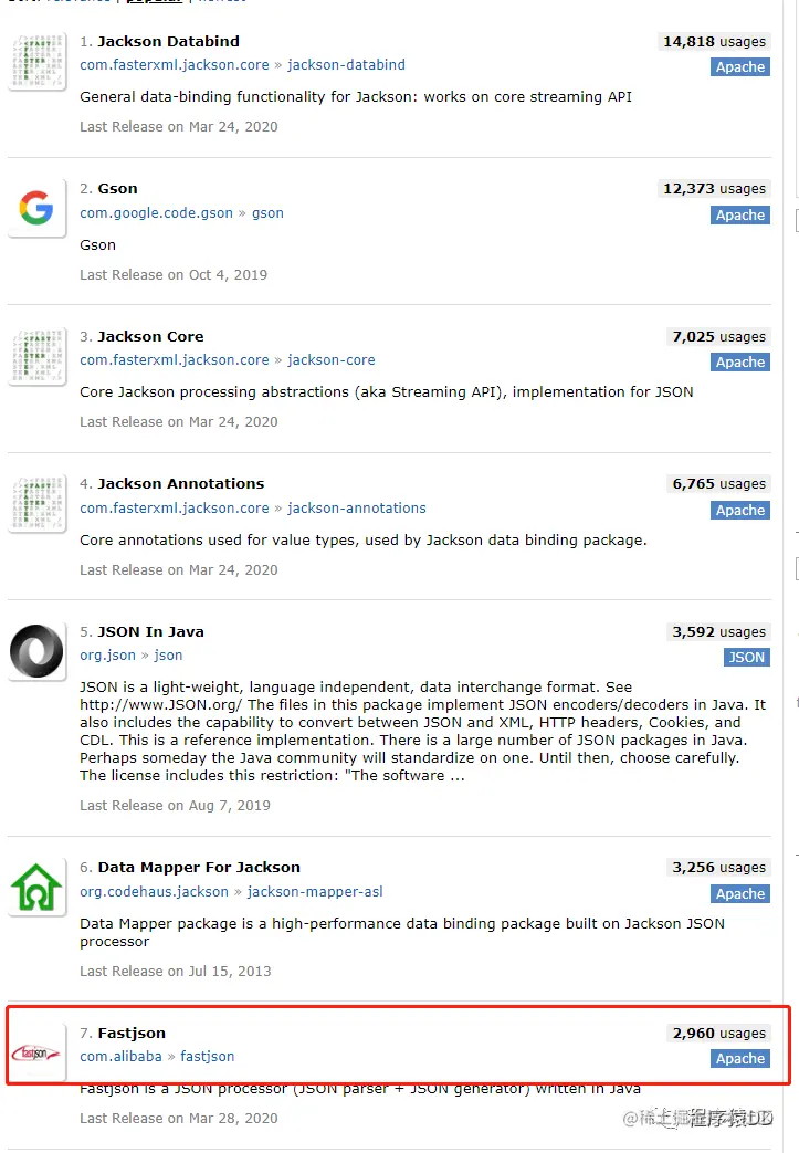 这里的调查研究并不是很充分,没有对内存占用、大文档的测试。! 在现代应用程序中,即使最慢的Gson,也是满足需求的;解析文档速度的快慢,并不能作为选型的唯一标准,可能连主要标准都算不上。对IO优化,并行处理等优化措施,比选用一个更快的库更有效。 三、FastJson并没有那么流行 然而,FastJson并没有那么流行,有一个最直观的数据,那就是在Maven的中的引用量,和Jackson和Gson不在一个数量级,和Jackson强大的家族更没法比。