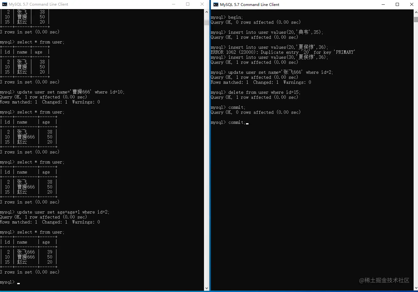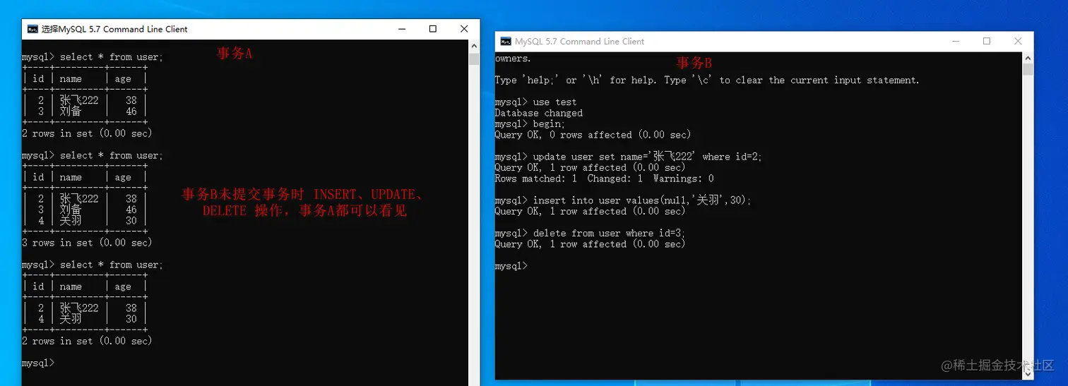 幻读: 幻读是针对数据插入 (INSERT) 操作来说的。假设事务A对某些行的内容作了更改,但是还未提交,此时事务B插入了与事务A更改前的记录相同的记录行,并且在事务A提交之前先提交了,而这时,在事务A中查询,会发现好像刚刚的更改对于某些数据未起作用,但其实是事务B刚插入进来的,让用户感觉很魔幻,感觉出现了幻觉,这就叫幻读。