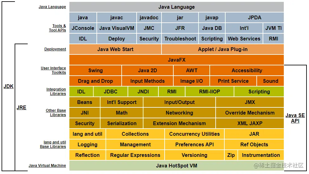 程序经过jdk编译后形成字节码文件,由JVM来运行,JVM运行字节码文件时需要用到JRE类库中的基础类