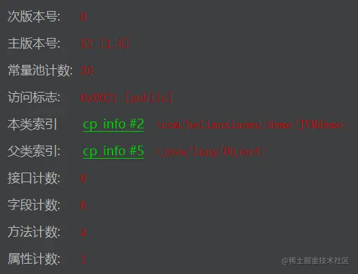 除此之外,虚拟机规范还要求字节码文件中还要包含JDK版本信息 ,常量池中的常量数量,类的访问权限,该类和父类在常量池中的地址信息等,就像下图一样