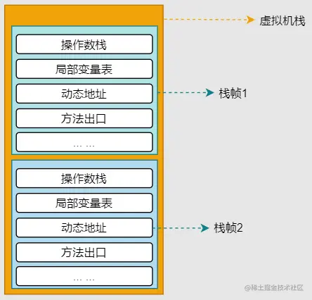 每个栈帧包含局部变量表、操作数栈、动态地址、方法出口等