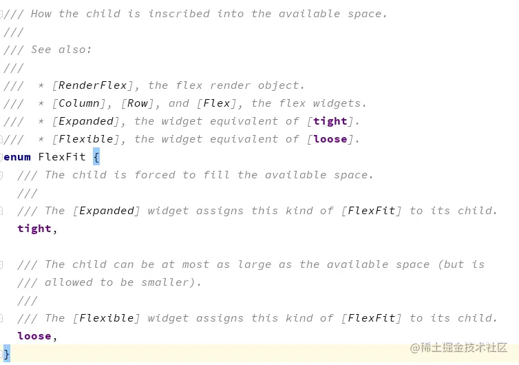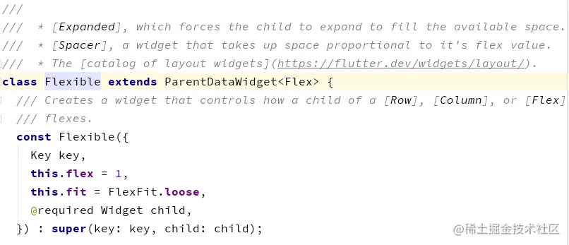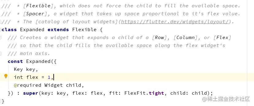 查源码看到了Flexible和Expanded的关系,Expanded是Flexible的子类。注意到Flexible有个属性fit。 Expanded传值FlexFit.tight,Flexible默认值FlexFit.loose