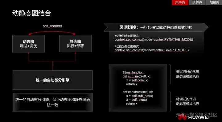 用户态。这一层面主要决定用户的使用方式,具体分为动态图和静态图两种模式。静态图效率高,但是对开发者不够友好;动态图易编程,但底层性能会慢很多。用户希望能尽可能结合这两种模式各自的优势,这对框架而言是一个难题。