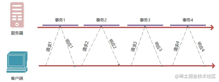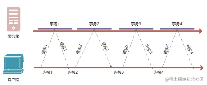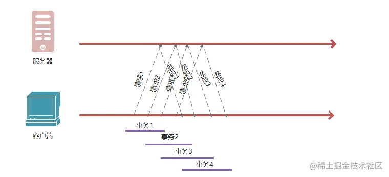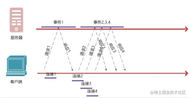 每个事务都有自己的TCP连接,只是并行处理。