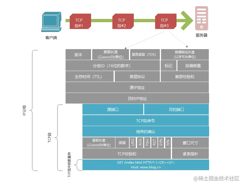 TCP的数据是通过名为IP分组(或IP数据报)的小数据块来发送的。HTTP位于TCP/IP协议栈的最顶层。