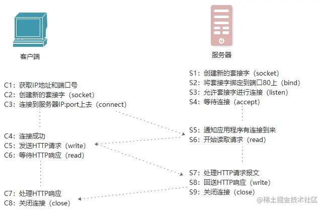 客户端和服务端在实现HTTP事务时所应执行的步骤: