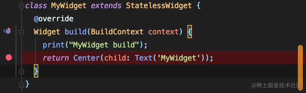 为了探究setState()后页面的渲染流程,我在MyWidget的build方法里面加了个断点: