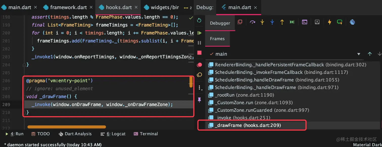 可以看到首先执行了hooks.dart里面的_drawFrame方法: