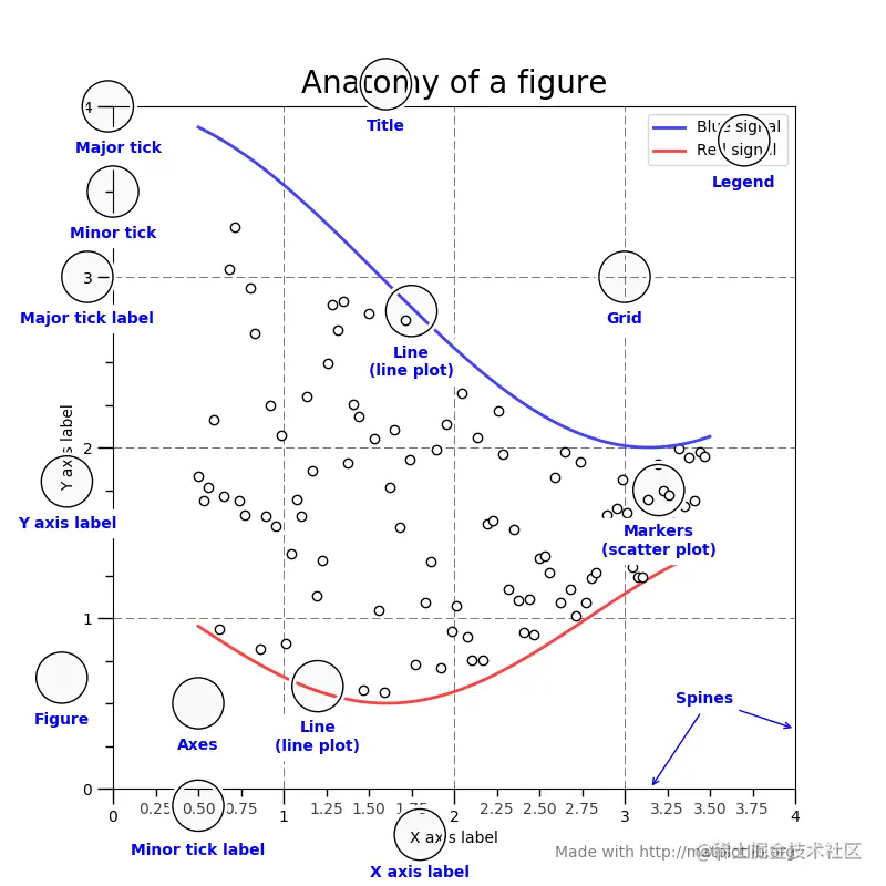 首先我们认识figure(画布),比如legend我们在上文中提到过,是线条标签的展示。grid所圈住的虚线是网格参考线。Title/x axislabel等文本标签。 这张图有助于我们对figure有一个值观的理解。