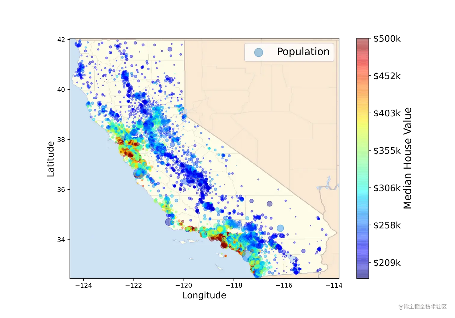 我们以美国加州房价数据为例,导入加州房价数据绘制散点图,同时导入加州地图图片,查看地图经纬度对应房价的数据。同时使用颜色栏,绘制热度图像。