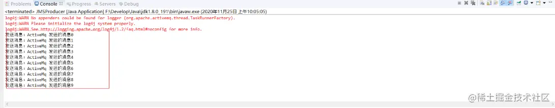 package com.zichen.activemq; import javax.jms.Connection; import javax.jms.ConnectionFactory; import javax.jms.Destination; import javax.jms.JMSException; import javax.jms.MessageProducer; import javax.jms.Session; import javax.jms.TextMessage; import org.apache.activemq.ActiveMQConnection; import org.apache.activemq.ActiveMQConnectionFactory; /** * 消息生产者 * * @author Administrator * */ public class JMSProducer { // 默认连接用户名称 private static final String USERNAME = ActiveMQConnection.DEFAULT_USER; // 默认连接密码 private static final String PASSWORD = ActiveMQConnection.DEFAULT_PASSWORD; // 连接地址 private static final String BROKURL = ActiveMQConnection.DEFAULT_BROKER_URL; // 消息数量10 private static final int SENDNUM = 10; public static void main(String[] args) { // 连接工厂 ConnectionFactory connectionFactory; // 连接 Connection connection = null; // 会话 接收信息和发送信息 Session session; // 消息的目的地 Destination destination; // 消息生产者 MessageProducer messageProducer; // 实例化连接工厂 connectionFactory = new ActiveMQConnectionFactory(JMSProducer.USERNAME, JMSProducer.PASSWORD, JMSProducer.BROKURL); try { // 通过工厂获取连接 connection = connectionFactory.createConnection(); connection.start();// 启动 session = connection.createSession(Boolean.TRUE, Session.AUTO_ACKNOWLEDGE);// 创建session destination = session.createQueue("FirstQueue1");// 创建消息队列 messageProducer = session.createProducer(destination);// 创建消息生产者 sendMessage(session, messageProducer);// 发送消息 session.commit();// 才会发送消息 } catch (Exception e) { e.printStackTrace(); } finally { // 释放资源 if (connection != null) { try { connection.close(); } catch (JMSException e) { e.printStackTrace(); } } } } /** * 发送消息 * * @param session * @param messageProducer * @throws JMSException */ public static void sendMessage(Session session, MessageProducer messageProducer) throws JMSException { for (int i = 0; i < JMSProducer.SENDNUM; i++) { TextMessage message = session.createTextMessage("ActiveMq 发送的消息" + i); System.out.println("发送消息:" + "ActiveMq 发送的消息" + i); messageProducer.send(message); } } }结果