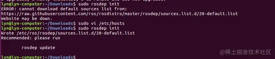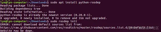 rosdep update 会在你的账户中初始化 rosdep 系统,该命令在你的根目录下保存一些文件,文件夹名为 .ros,因为是初始化,这个命令只需要运行一次。该命令是在普通用户下运行。