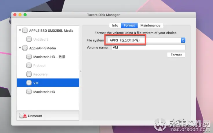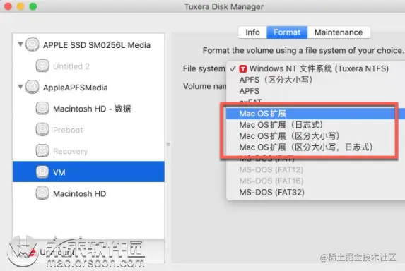 首先介绍一下APFS(区分大小写)和APFS这两种系统格式,使用APFS分区可以动态调整自身大小,用户只需要指定所要分区的数量,然后文件系统会在运行时进行磁盘分配。