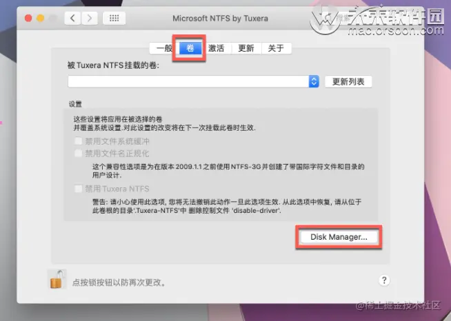 打开Tuxera NTFS磁盘管理界面,并点击 卷选项右下角中的 Disk Manager按钮。