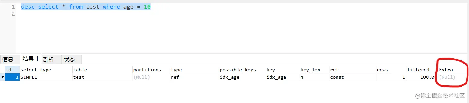可以看到extra列有一个 using index , 这个的意思就是使用了覆盖索引,无需回表查询了。