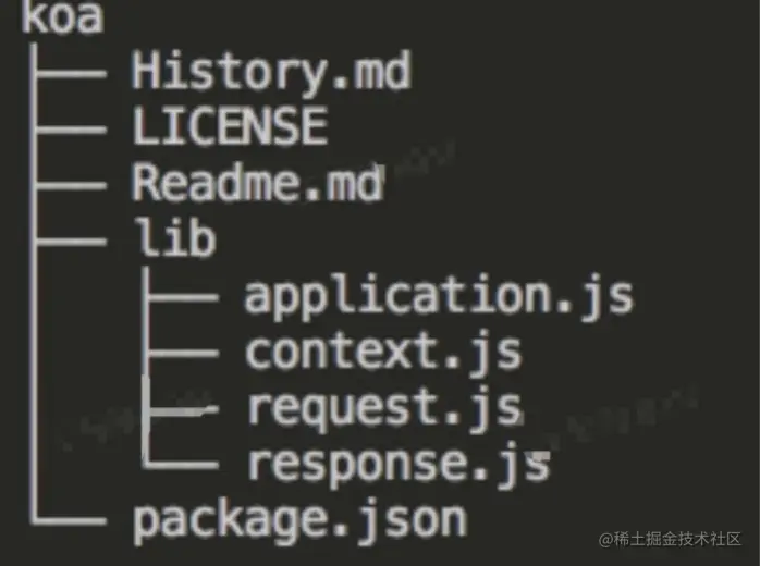 除了readme、历史信息、开源许可证,真正的源码部分只有四个文件。application、context、request、response。 打开package.json文件,我们可以看到koa的入口。