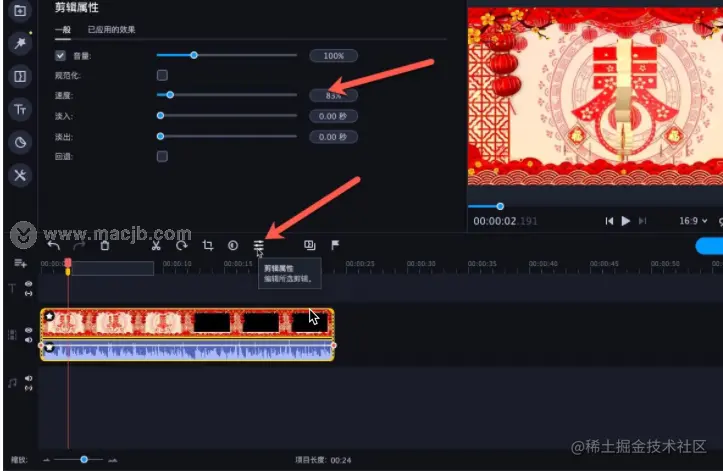 在画面右上方的播放器视窗中观看预览短片,确认音轨的效果符合预期。别忘了,改变影像轨的速度同时也会改变音轨的速度。如果您想要保留原始的音讯速度,可以使用以下技巧: