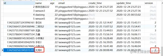 按照乐观锁的原理,user2是可以更新成功的,也就是name会修改为“大周4”,version会加1。user因为前后拿到的版本号不对,更新失败。
