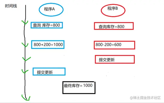 - 程序A 查询到了这条数据,得到库存是800,准备+200更新成1000,但是还没更新。