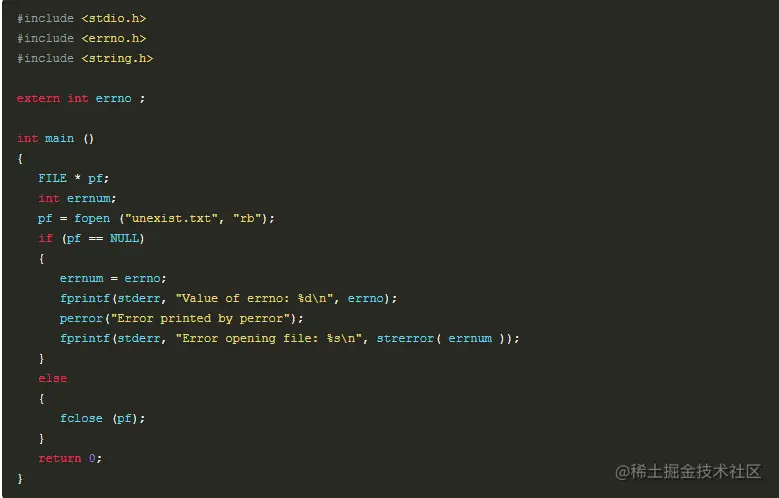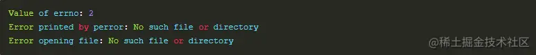 所以,C 程序员可以通过检查返回值,然后根据返回值决定采取哪种适当的动作。开发人员应该在程序初始化时,把 errno 设置为 0,这是一种良好的编程习惯。0 值表示程序中没有错误。