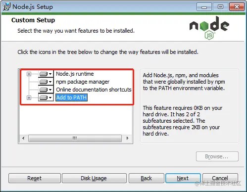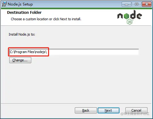 上图中,如果安装到其他盘,这个路径要注意两点:1. 路径中不能有空格;2. 后缀 nodejs 不能省略。