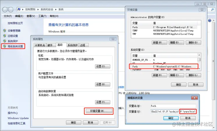安装完成后,检查环境变量中的 path,是否有 yarn 的路径: