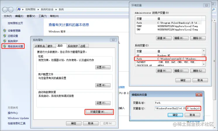 安装完成后,检查环境变量中的 path,是否有 nodejs 的路径: